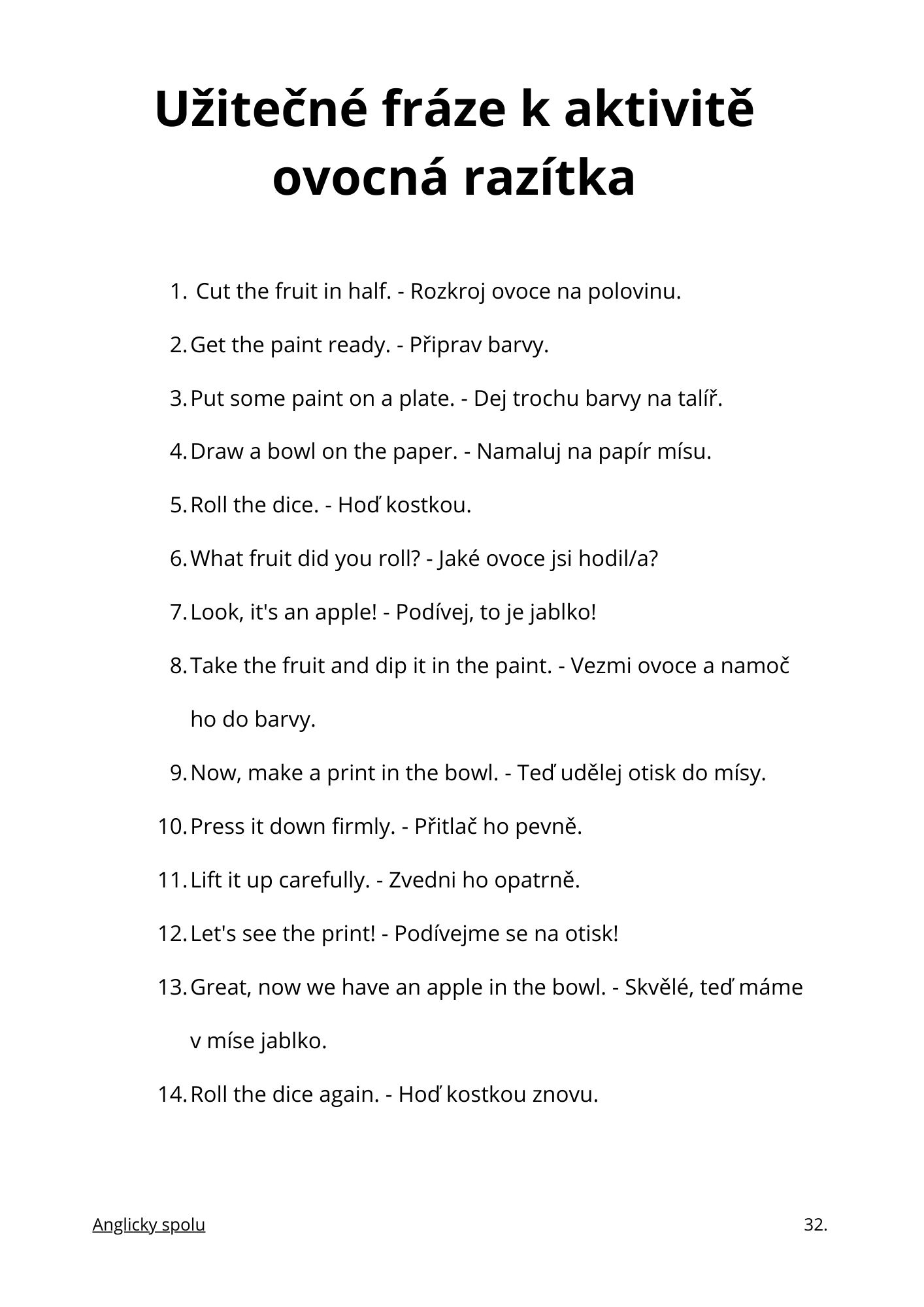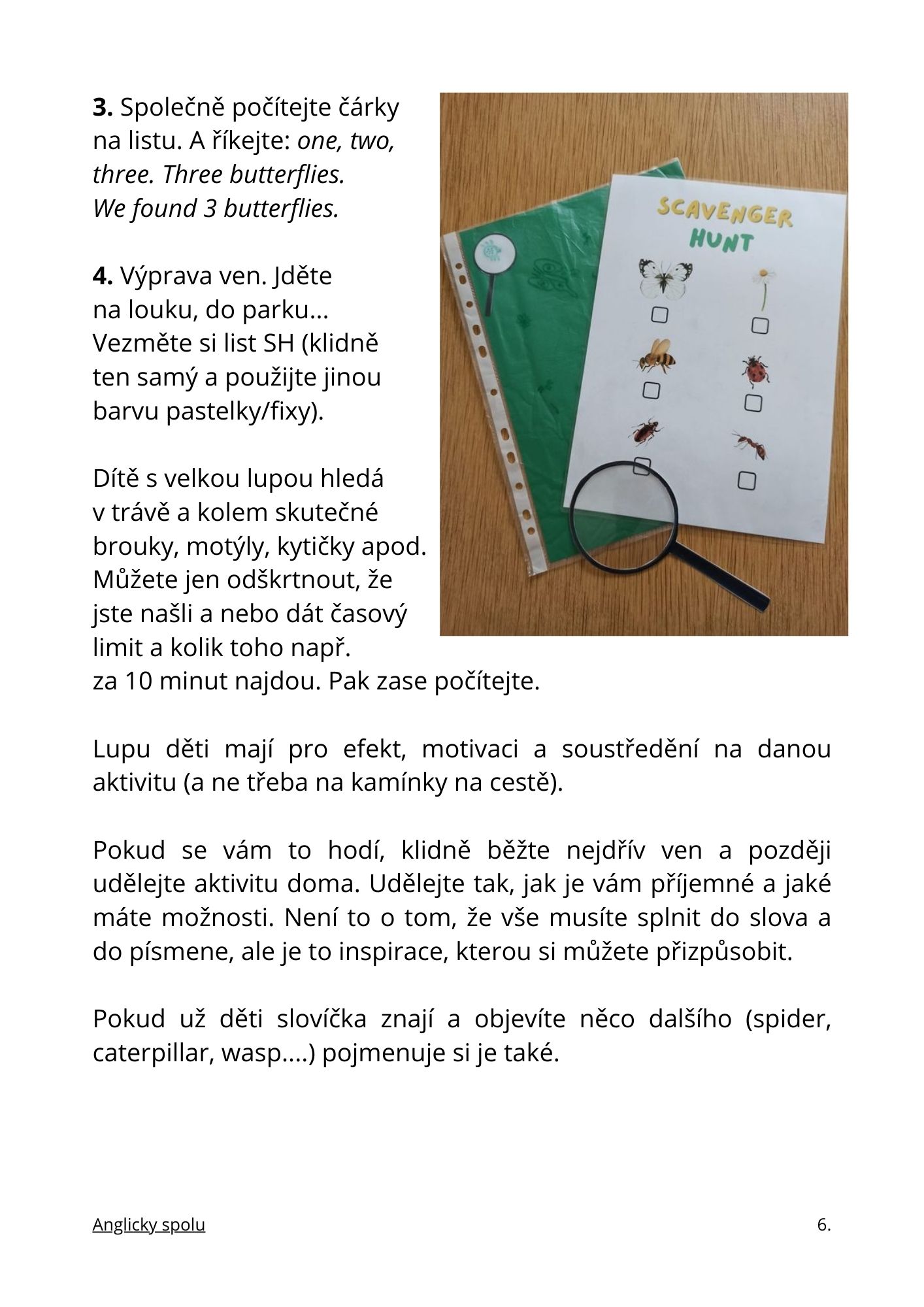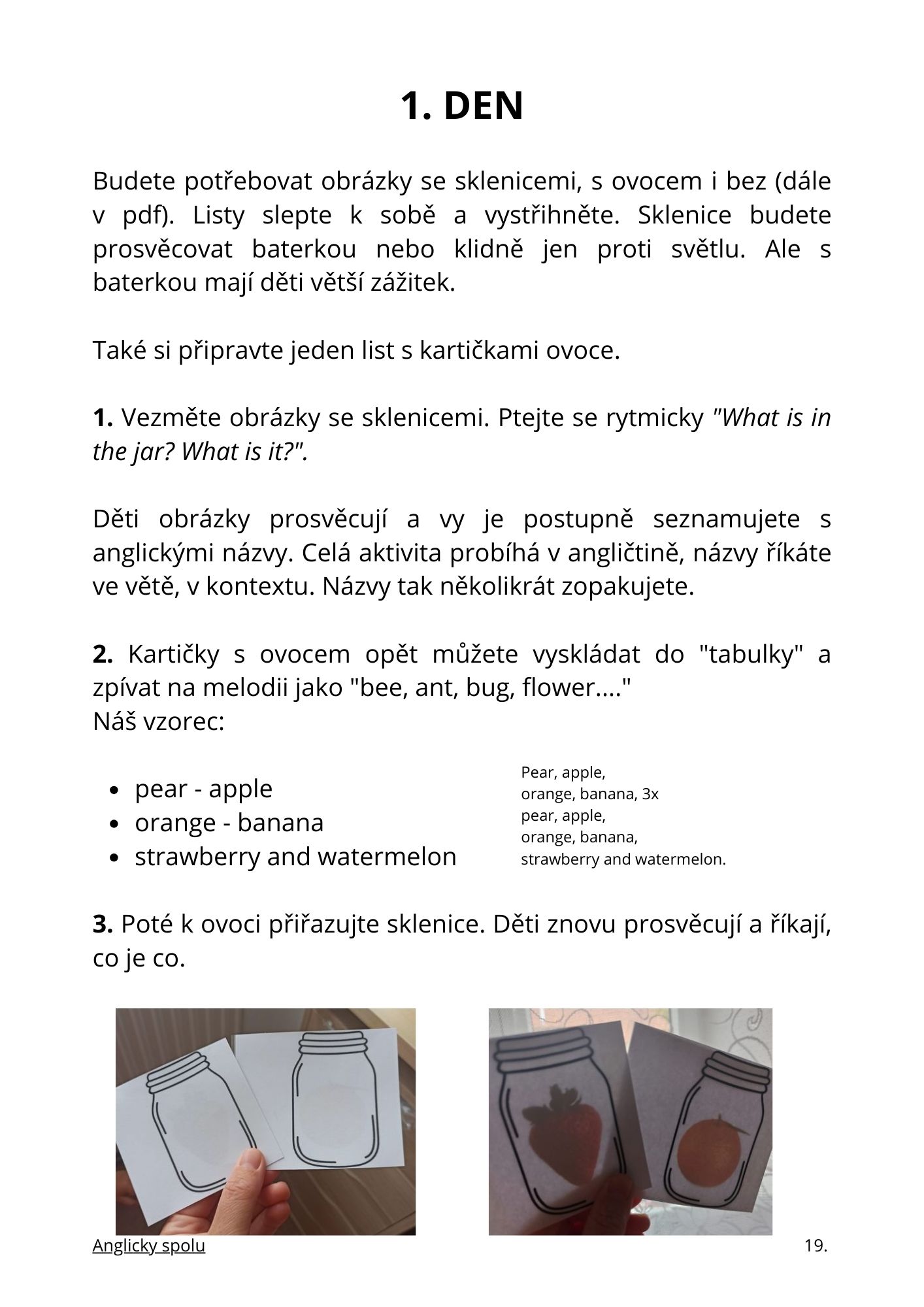 - Budu muset pořád něco tisknout, stříhat a chystat dopředu?Některé aktivity jsou založené na pdf materiálech, jejichž přípravu můžete už pojmout jako společnou činnost s dítětem v angličtině a chystat, tisknout a stříhat společně. Během toho můžete dítě učit slovní zásobu jako například cut, scissors, paper, apod. V kurzu najdete i aktivity bez tisknutelných materiálů (například piknik).